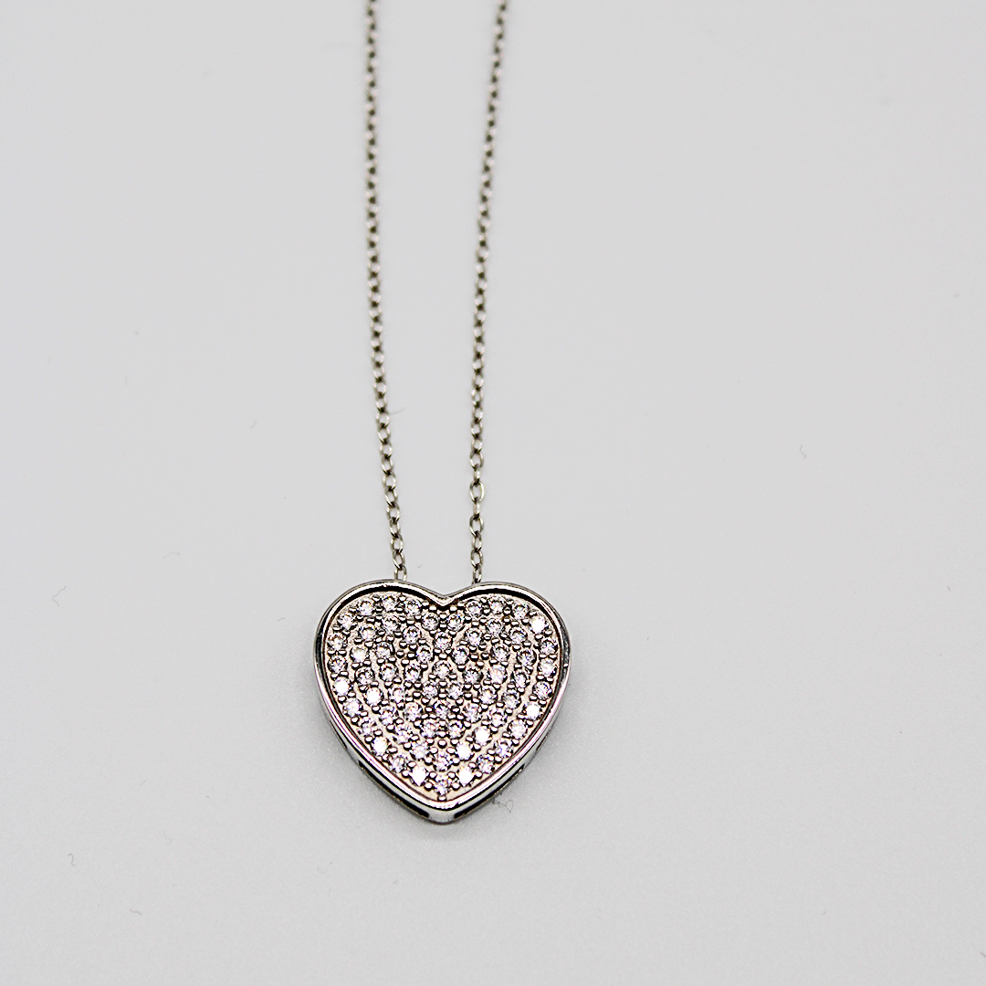 Il ciondolo a forma di cuore, ricoperto di luminosi zirconi, riflette la luce con ogni movimento, illuminando il décolleté con eleganza.