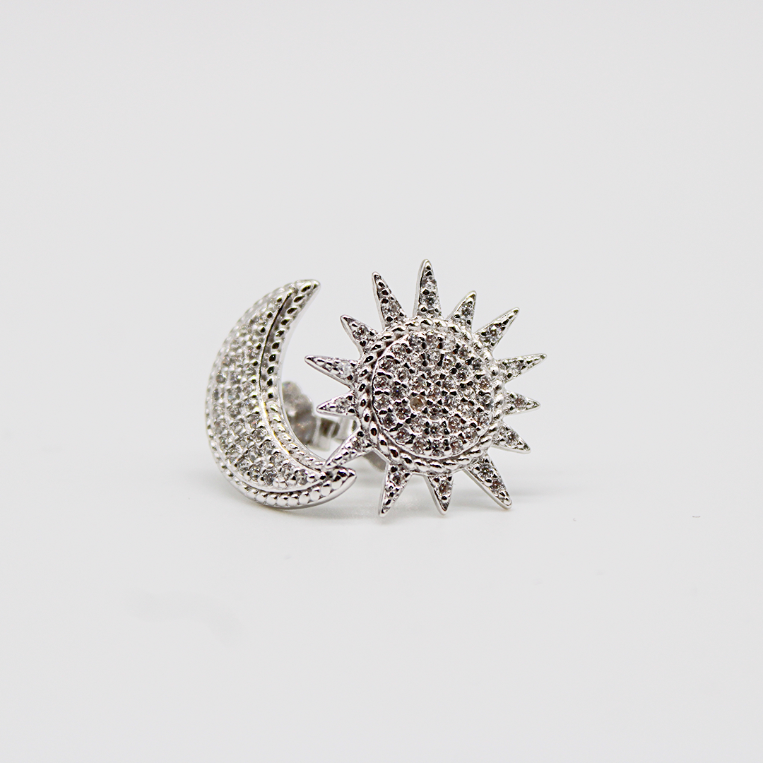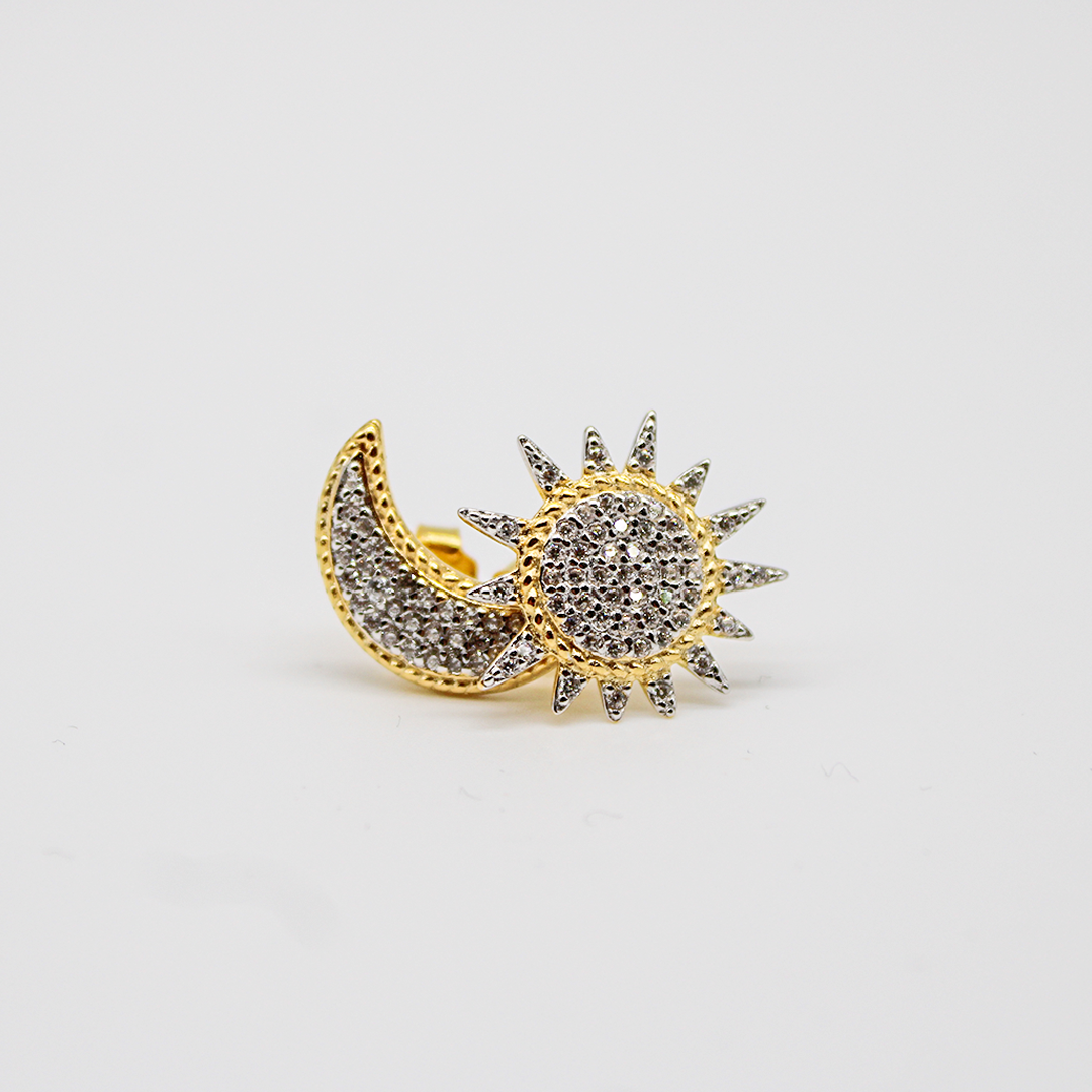 Un orecchino a forma di sole e l'altro a mezzaluna, entrambi tempestati di luminosi zirconi, donano al tuo look un tono poetico e cosmico.
